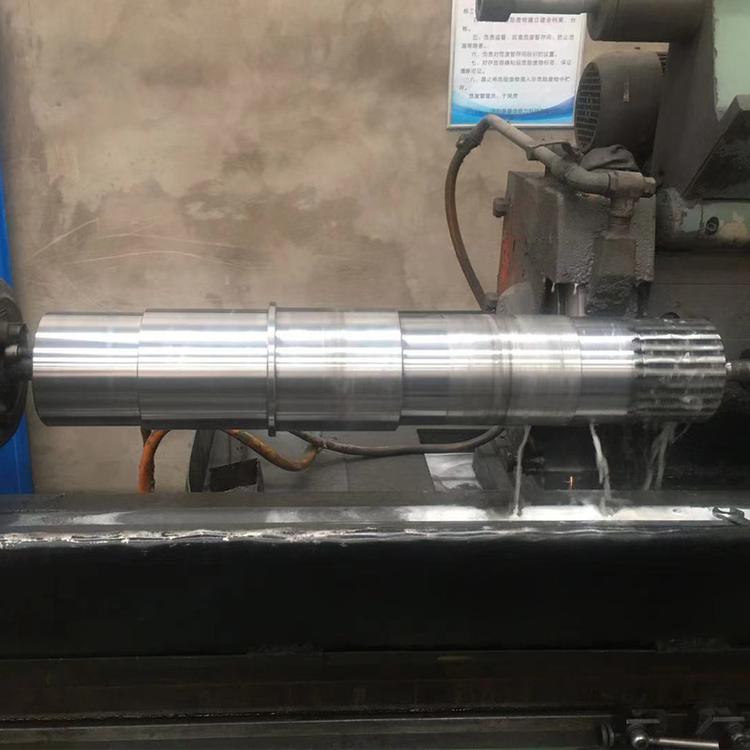 棒料、鍛件 → 粗車加工 → 調質 → 精車加工 → 銑鍵槽 → 熱處理(表面淬火貨滲碳淬火) → 研磨中心孔 → 粗磨 → 精磨 → 成品檢測包裝